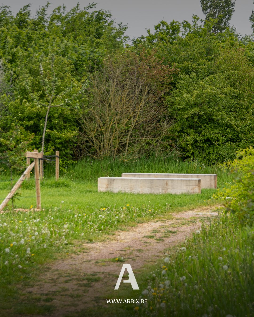 Door te werken rond het bestaande groen ontstaat een zitplek die natuurlijk aanvoelt, uitnodigt tot pauze en volledig opgaat in het landschap.
